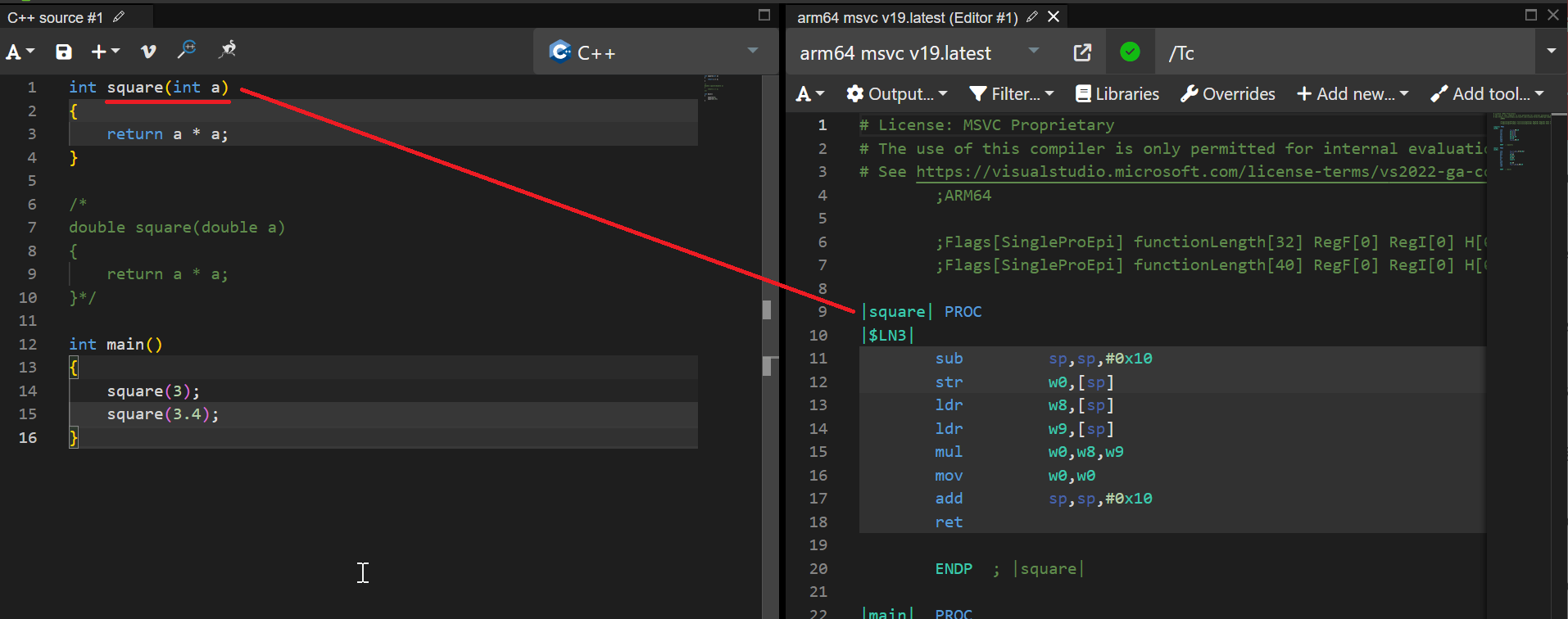 /tc 옵션을 주어 C로 컴파일을 해보면, sqaure라는 컴파일 할때, 이름을 바꾸지 않았음을 확인할 수 있다.