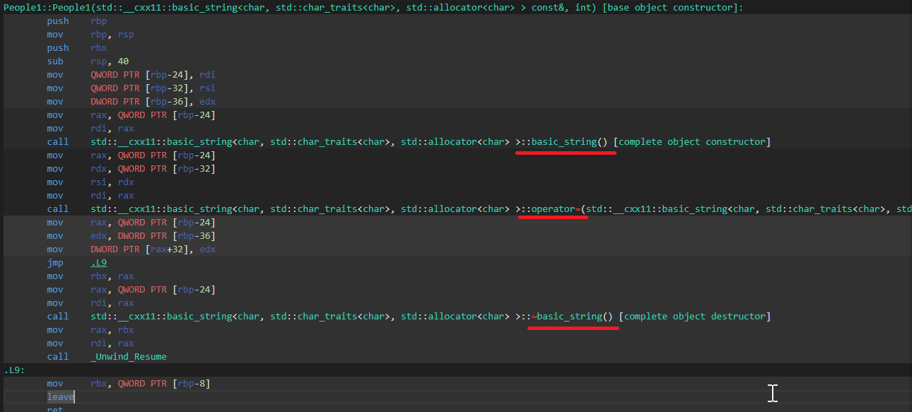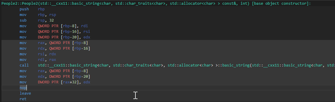 - Compiler Explorer 로 확인해보면, People1에서는 string에 대한 디폴트 생성자와 대입 연산자를 부르는 것이 확인된다.