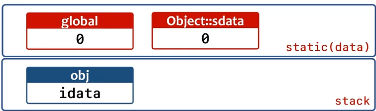 - 객체 생성시 static member data는 객체의 메모리에는 포함되지 않는다.