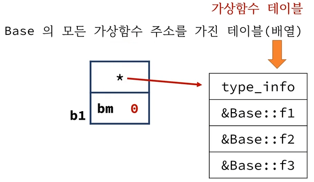 - 이는 Base 타입의 객체가 자신의 가상함수가 몇번지에 있는지 알기 위해 추가되는 것이다.