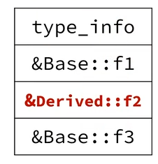 - 다음과 같이 Derived vTable은 자신이 Override한 Derived f2에 대해서만 재정의 vtable에 담기는 것을 확인할 수 있다.