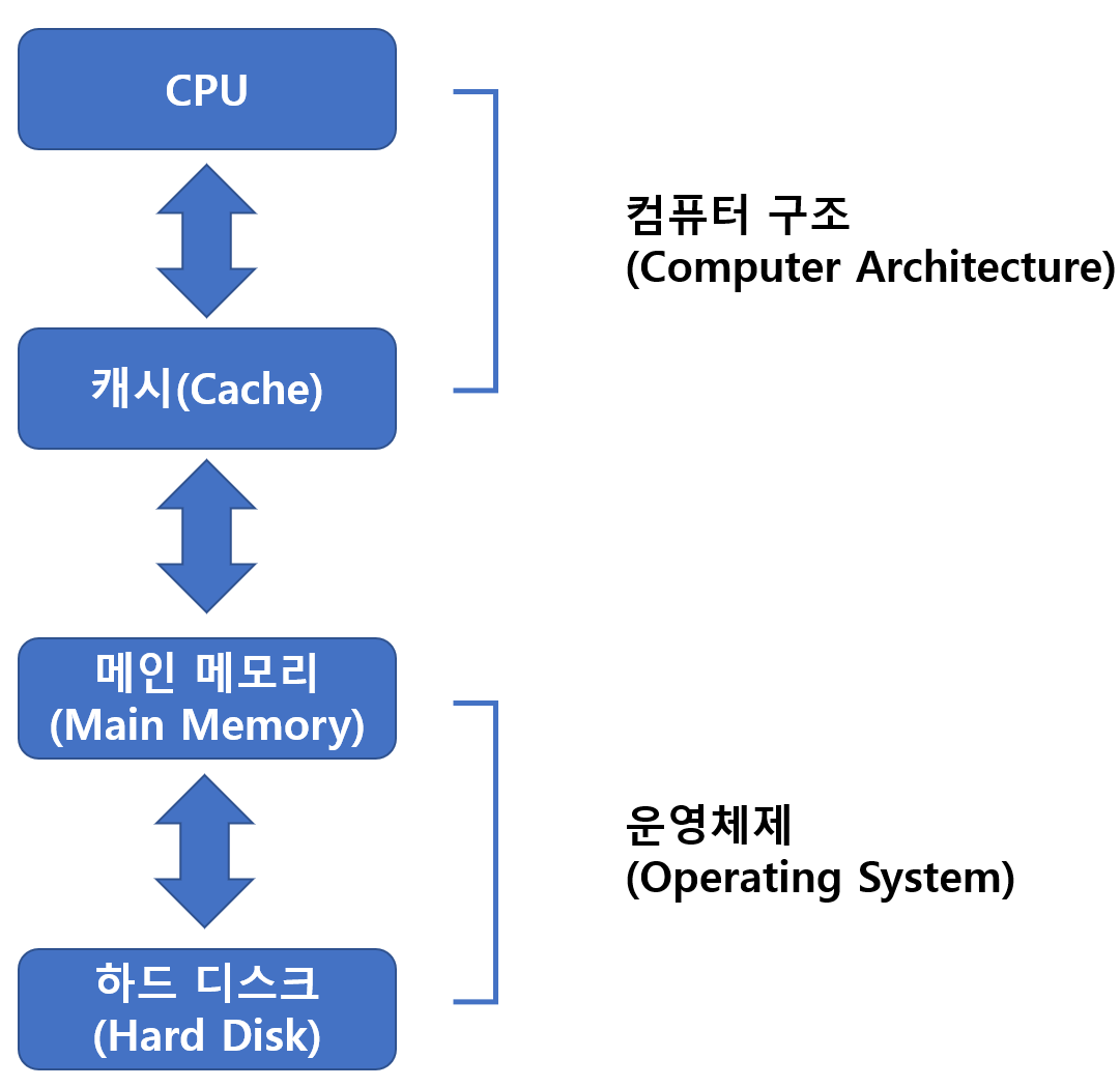 - 일반적으로는 CPU와 캐시까지를 '컴퓨터 구조'로 이야기 하고, 일반적으로 '컴퓨터 구조'에서 이를 다룬다.