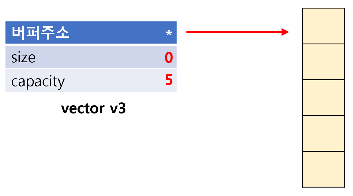 - 지금은 vector에 충분한 메모리 공간이 존재하지 않는다. capacity와 size가 일치하다.
