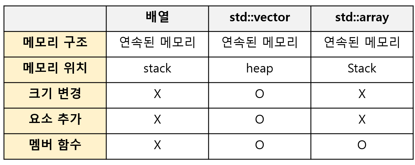 - std::array는 멤버 함수가 존재하고, 메모리 상에 stack에 놓인다.